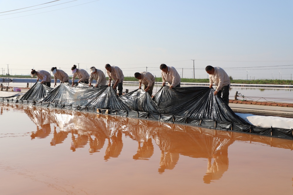 在破曉時(shí)分,日曬制鹽的萬畝鹽田被一輪旭日染上了一層金色的光輝,仿佛一夜之間,這片鹽堿地被冰封的魔力所籠罩,呈現(xiàn)出一種寧靜而又深邃的景象。凌晨4點(diǎn)半,那些勤勞的鹽灘工人早已熱火朝天地忙著活碴、修補(bǔ)塑布、加固浮板等保鹽保鹵工作。省勞模祝星星在巡灘時(shí)說道:“現(xiàn)在正處梅雨季節(jié),我們戰(zhàn)高溫、搶晴天,在做好原鹽生產(chǎn)的基礎(chǔ)上,更要統(tǒng)籌做好防汛抗災(zāi)工程,確保安穩(wěn)度汛。當(dāng)然,我們對今年超額完成生產(chǎn)指標(biāo)任務(wù)充滿信心。”這番話無疑是對他們辛勤勞作的一種樂觀詮釋。