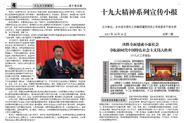 10月27日,灌西投資公司黨的十九大精神第一次學習會議上提出五確保,即確保學習入腦入心;確保領(lǐng)會認真準確;確保宣傳宣講生動;確保十九大結(jié)合實際;確保干好當前。在投資公司黨委的帶領(lǐng)下,老干黨支部掀起了學習貫徹黨的十九大精神的熱潮,重在學懂、弄通、做實上下工夫。