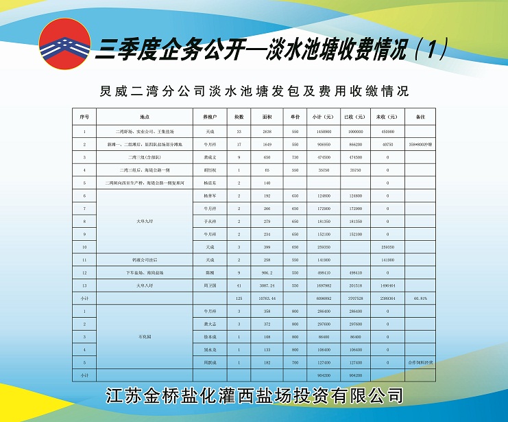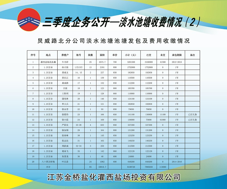 (二)淡水養(yǎng)殖池塘發(fā)包及費(fèi)用收繳情況:共發(fā)包淡水養(yǎng)殖池塘210塊,面積21574.14畝,應(yīng)收租賃費(fèi)1420.5612萬(wàn)元,已收租賃費(fèi)1170.2558萬(wàn)元,欠收租賃費(fèi)250.3054萬(wàn)元,收繳率為82.38%,正在加緊催收中。