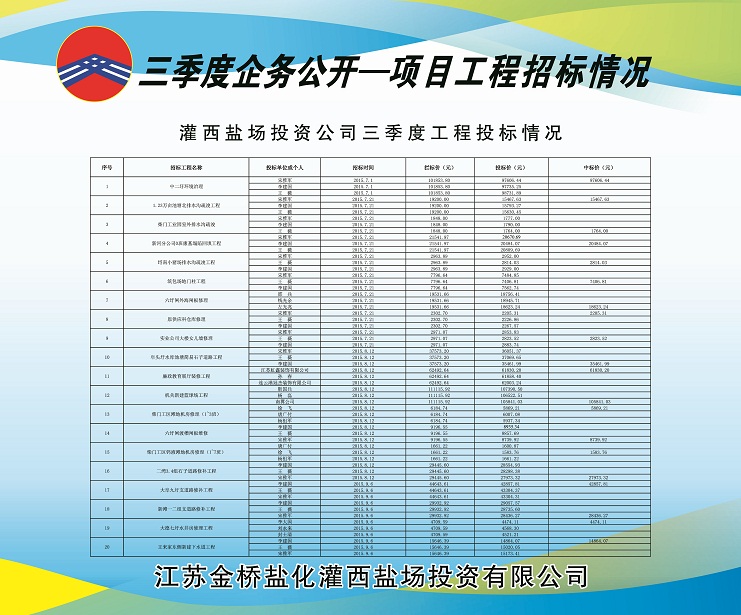 第三次是在8月12日,招標(biāo)項(xiàng)目是:1、阜頭圩水庫(kù)池塘簡(jiǎn)易石子道路工程,中標(biāo)價(jià)為李建國(guó)35461.99元。2、廉政教育展廳裝修工程,中標(biāo)價(jià)為江蘇虹鑫裝飾有限公司61830.20元。3、機(jī)關(guān)新建籃球場(chǎng)工程,中標(biāo)價(jià)為南翼公司105841.03元。4、機(jī)柴門工區(qū)灘地機(jī)房修理(1~3班),中標(biāo)價(jià)為徐飛5869.21元。5、六圩閘渡槽閘板維修,中標(biāo)價(jià)為宋雅軍8739.92。6、柴門工區(qū)鈣液灘地機(jī)房修理(1~7班),中標(biāo)價(jià)為徐飛1583.76元。7、二灣3.4組石子道路修補(bǔ)工程,中標(biāo)價(jià)為宋雅軍27973.32元