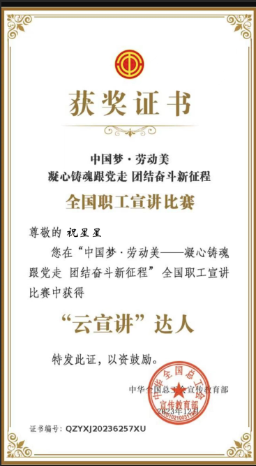 近日,全國總工會公布了“中國夢·勞動美——凝心聚魂跟黨走 團(tuán)結(jié)奮斗新征程”全國職工“云宣講”比賽結(jié)果,我公司勞模祝星星同志喜獲“云宣講”達(dá)人稱號。
