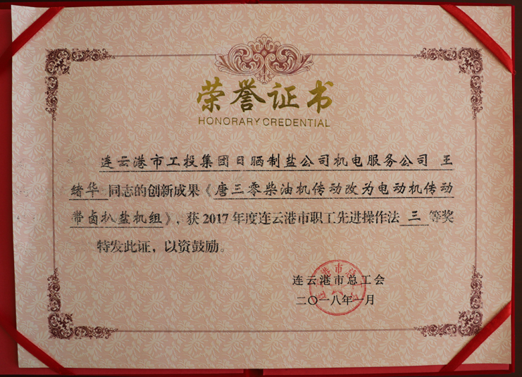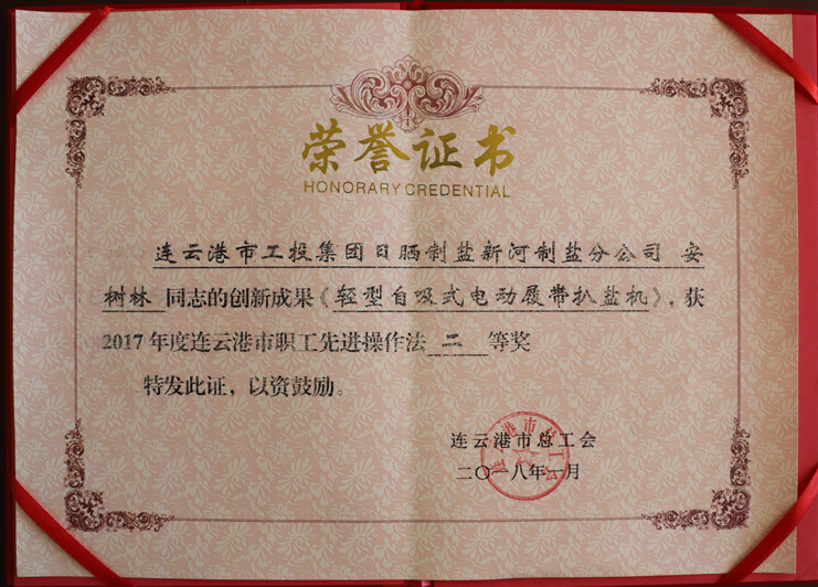 近日,日曬制鹽新河制鹽分公司安樹林同志的創(chuàng)新成果《輕型自吸式電動(dòng)履帶扒鹽機(jī)》,被市總工會評為2017年度連云港市職工先進(jìn)操作法二等獎(jiǎng),日曬制鹽公司機(jī)電服務(wù)公司王緒華同志的創(chuàng)新成果《唐三零柴油機(jī)傳動(dòng)改為電動(dòng)機(jī)傳動(dòng)帶鹵扒鹽機(jī)組》,被市總工會評為2017年度連云港市職工先進(jìn)操作法三等獎(jiǎng)。(西工)