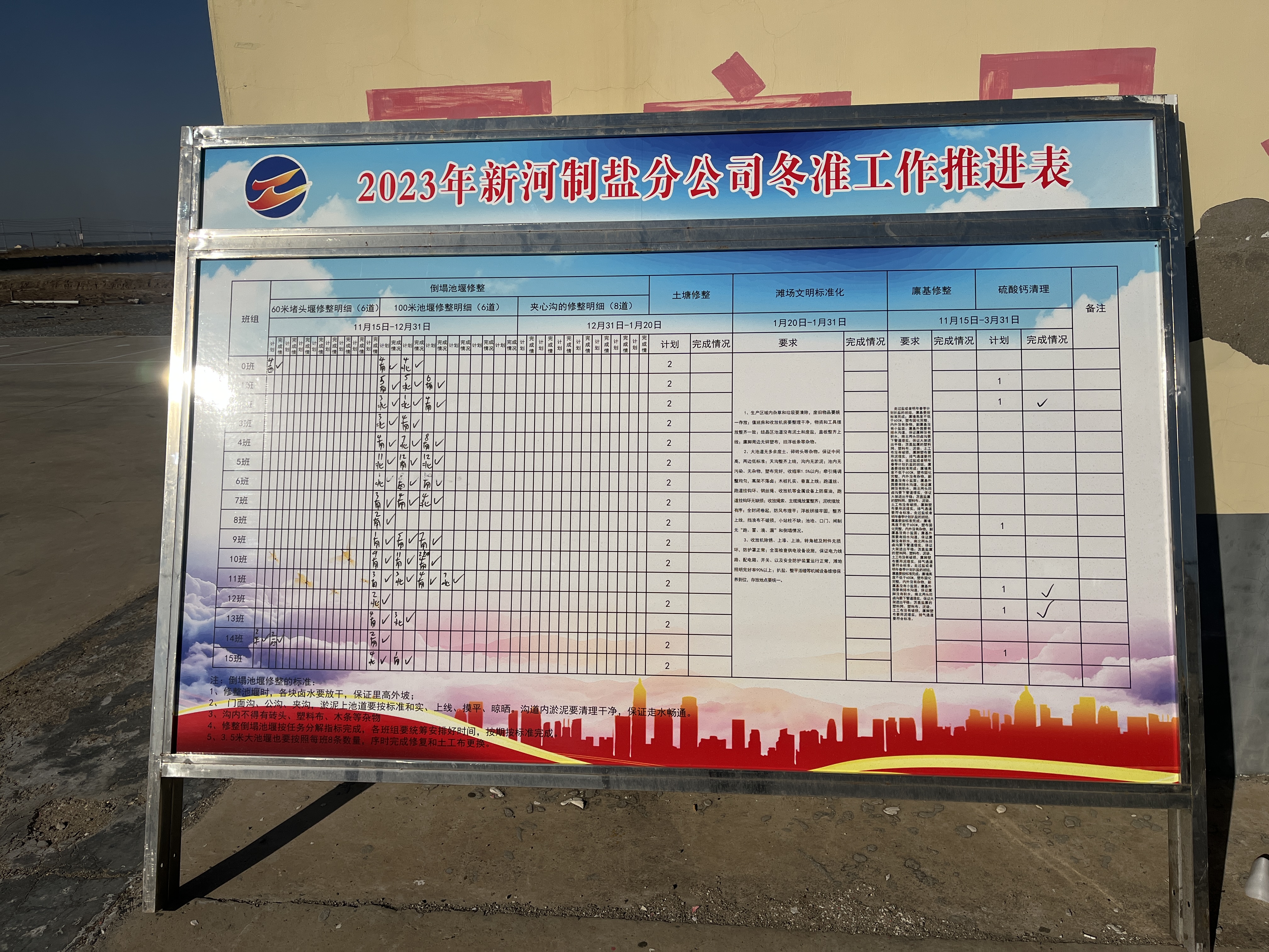 冬季是日曬制鹽收儲鹵水、扒土塘、整理灘場文明的最佳時期,也是為2024年工作起好頭、邁好步的關鍵時期,自冬準工作開展以來,新河制鹽分公司制定冬準工作推進表,掛圖作戰(zhàn)按時推進冬準進度。