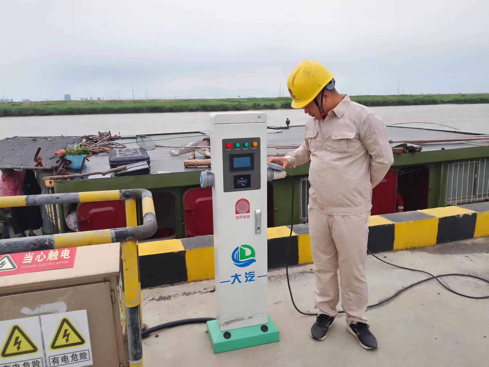 為了方便船只用上綠色環(huán)保電,宵洋物流公司在岸電基礎(chǔ)上進(jìn)行升級(jí)改造,投資4萬(wàn)余元,安裝5個(gè)岸電配電系統(tǒng),以替代柴油發(fā)電,從而降低船只??繒r(shí)間,消耗廢氣排放和嗓聲污染,每個(gè)電樁上帖有操作說(shuō)明書(shū)和注意事項(xiàng)等溫馨提示。接上專(zhuān)用電源,插入岸電接口,掃碼啟動(dòng)即可使用,安全高效,降低安全隱患。