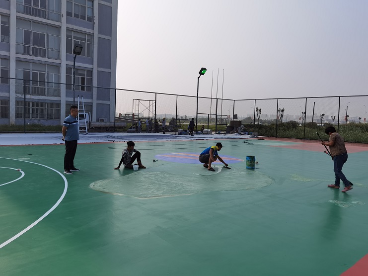 灌西籃球場總面積約510平米,附屬球場地面600平米,外圍護欄高3米。項目圍繞關(guān)鍵節(jié)點及重難點,強化施工組織,統(tǒng)籌施工進展?;@球場地面露天暴曬,溫度極高,仿佛蒸籠一般。施工人員在進行鑿地、涂漆時,僅幾分鐘的功夫,衣服從里到外被汗水浸濕,隨時有中暑的可能性,項目組把責任明確到個人,開展班前安全教育活動,保證施工安全。施工單位南翼工程公司負責人錢明偉克服人員緊缺,工期緊迫等問題,頂著高溫,始終奮戰(zhàn)在工程項目第一線。