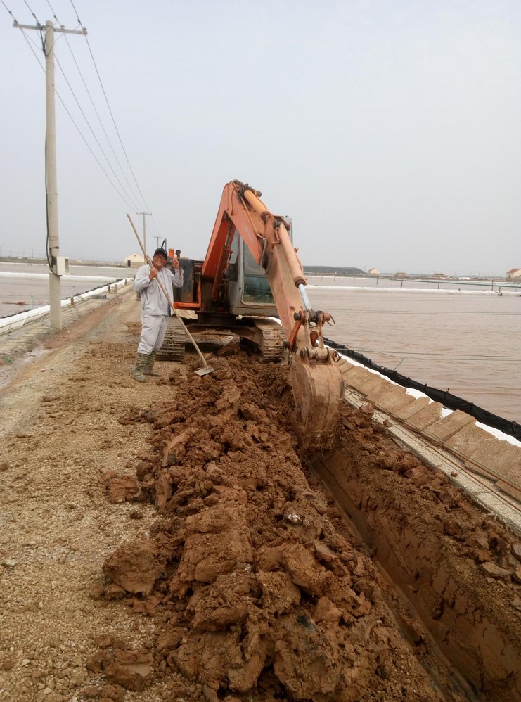埒南制鹽分公司8班,伴隨著挖掘機(jī)的轟鳴,日曬制鹽公司生產(chǎn)班組“天溝工程”正式進(jìn)入施工試驗(yàn)階段。天溝是海鹽生產(chǎn)的配套設(shè)施,在結(jié)晶區(qū)利用天溝加鹵能有效的減少鹵水的混雜,實(shí)行分質(zhì)分段結(jié)晶,是提高原鹽質(zhì)量的重要手段。日曬制鹽公司經(jīng)過(guò)反復(fù)調(diào)研論證,用傳統(tǒng)海鹽生產(chǎn)工藝架接礦鹵生產(chǎn),在生產(chǎn)班組架設(shè)天溝,實(shí)施串聯(lián)、并聯(lián)加鹵相結(jié)合,給鹵水的調(diào)配、除硫、除混帶來(lái)便利,實(shí)現(xiàn)分質(zhì)分段結(jié)晶,為原鹽質(zhì)量的提高寫下了重重的一筆,同時(shí)天溝加鹵可以減少班組流動(dòng)機(jī)泵的使用頻率,提高了班組整體安全生產(chǎn)系數(shù)。