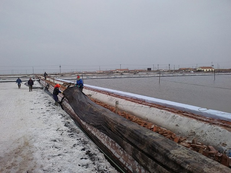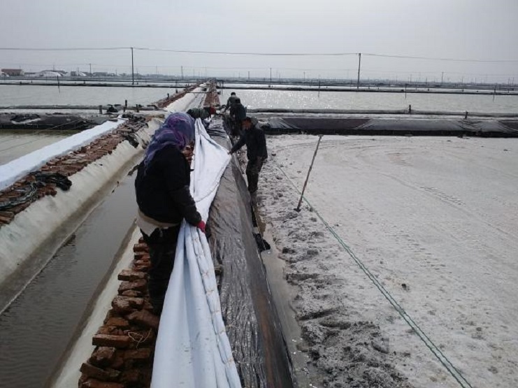 新河制鹽分公司為了盡快改善食用鹽基地面貌,減少池埝上固化紅磚風(fēng)化,沙塵落入鹽池內(nèi),對池鹽的污染,近期組織分公司職工,對基地塑池的紅磚固化池埝進(jìn)行處理,先用黑塑布把池埝重包一遍,然后再用土工布苫好。有效地減少了雜物落入池鹽中,為產(chǎn)合格食用鹽提供了良好生產(chǎn)環(huán)境。(圖為職工們正在苫蓋紅磚固化池埝。) (唐廣付)
