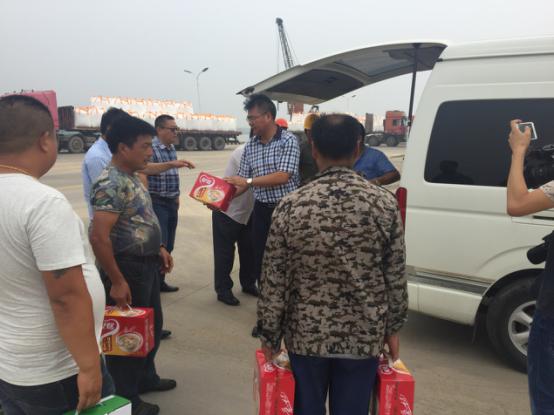 2017年7月18日星期二下午灌西鹽場(chǎng)投資公司領(lǐng)導(dǎo)到宵洋物流有限公司碼頭送清涼看望一線員工!在黨委書記董事長(zhǎng)王德志同志、總經(jīng)理李國(guó)文同志、工會(huì)主席王保平同志的帶領(lǐng)下親自到我宵洋物流有限公司碼頭看望一線員工,送清涼。炎炎夏日,酷暑當(dāng)頭一線員工永遠(yuǎn)沖鋒在前,領(lǐng)導(dǎo)的關(guān)懷更是永不停止!宵洋物流全體員工致謝?。ㄏ笸跞唬?br />