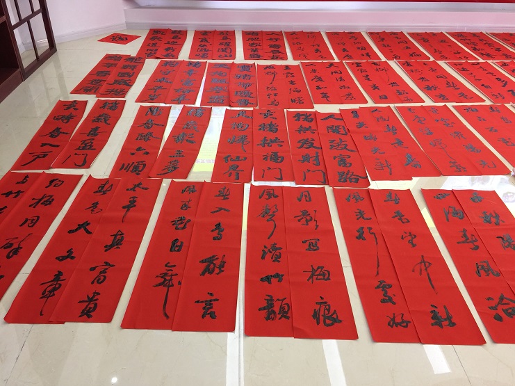 此次活動(dòng)共邀請(qǐng)了3位書法愛好者為職工免費(fèi)寫春聯(lián)、贈(zèng)春聯(lián),紅色的春聯(lián)和熱鬧的人群將活動(dòng)現(xiàn)場(chǎng)映襯得年味十足。書法愛好者們飽含熱情,擺開書案,攤開宣紙,揮毫潑墨,將真誠(chéng)的祝福賦諸筆端。宵洋物流的職工們紛紛趕來現(xiàn)場(chǎng)排隊(duì)幫忙,互相談?wù)撝鞲贝郝?lián)的寓意,有的根據(jù)新年心愿從準(zhǔn)備好的春聯(lián)中精心挑選特邀書寫,有的期望書法愛好者為其精心定制現(xiàn)場(chǎng)創(chuàng)作。濃濃的情意、真摯的祝福溢于字里行間,大家拿著一幅幅寓意喜慶,飽含祝福的春聯(lián),喜笑顏開,不停表達(dá)著對(duì)灌云縣海事局和縣書法協(xié)會(huì)的感謝。(宵洋物流 邱利民)