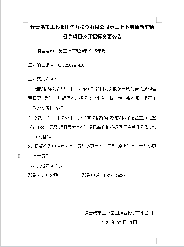連云港市工投集團(tuán)灌西投資有限公司員工上下班通勤車輛租賃項(xiàng)目公開招標(biāo)變更公告