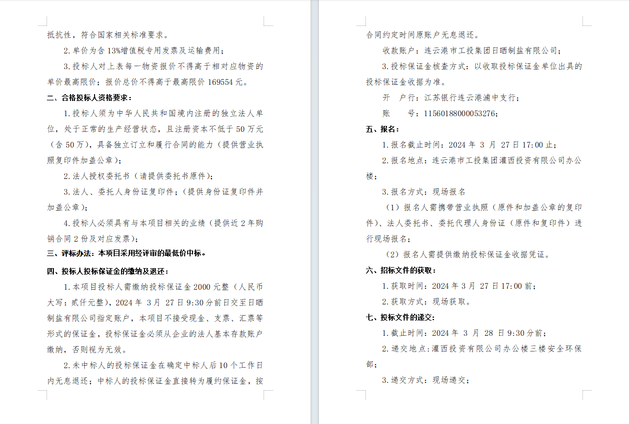 連云港市工投集團日曬制鹽有限公司2024年度勞保用品采購項目公開招標(biāo)公告