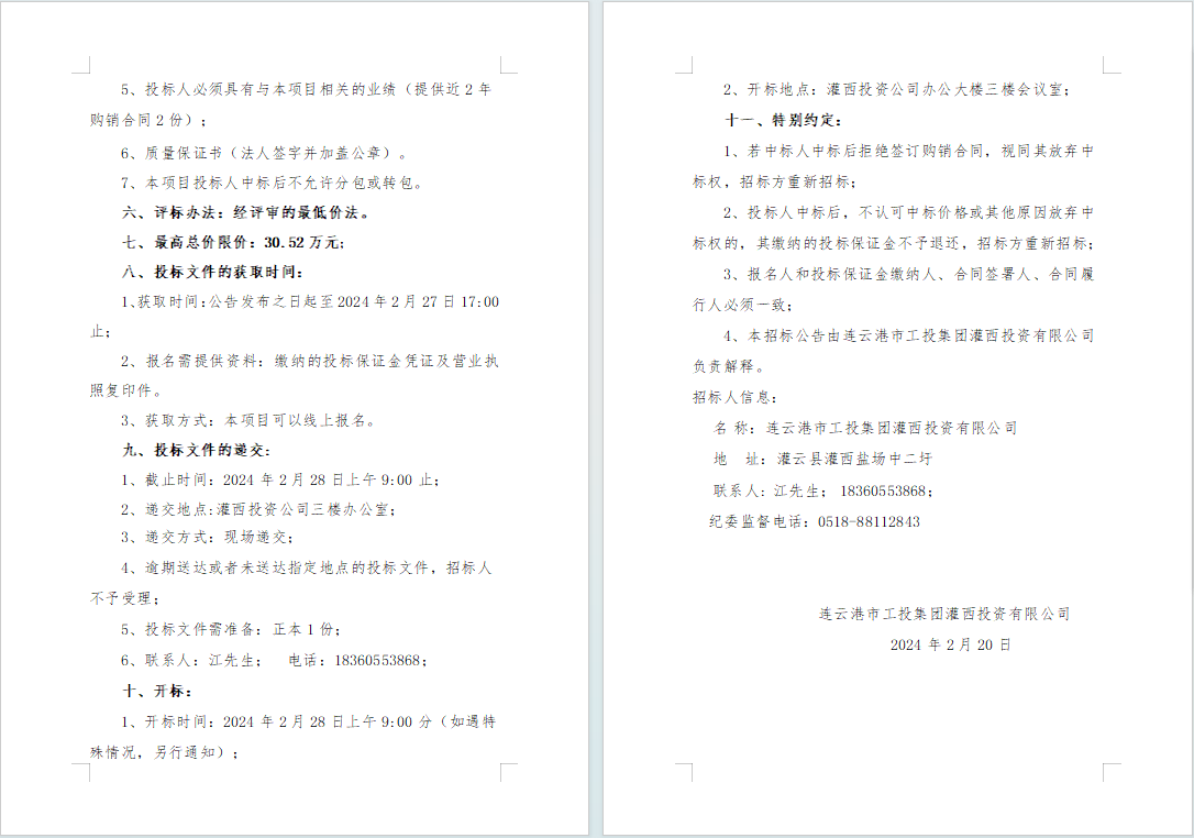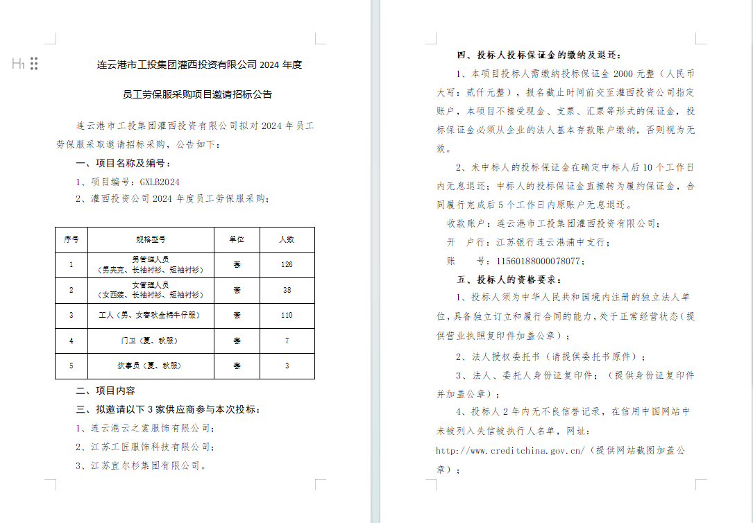 連云港市工投集團(tuán)灌西投資有限公司2024年度員工勞保服采購項目邀請招標(biāo)公告