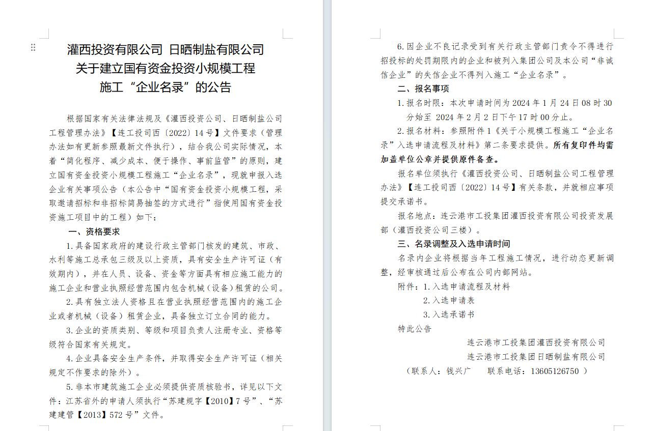 灌西投資有限公司日曬制鹽有限公司關(guān)于建立國(guó)有資金投資小規(guī)模工程施工“企業(yè)名錄”的公告