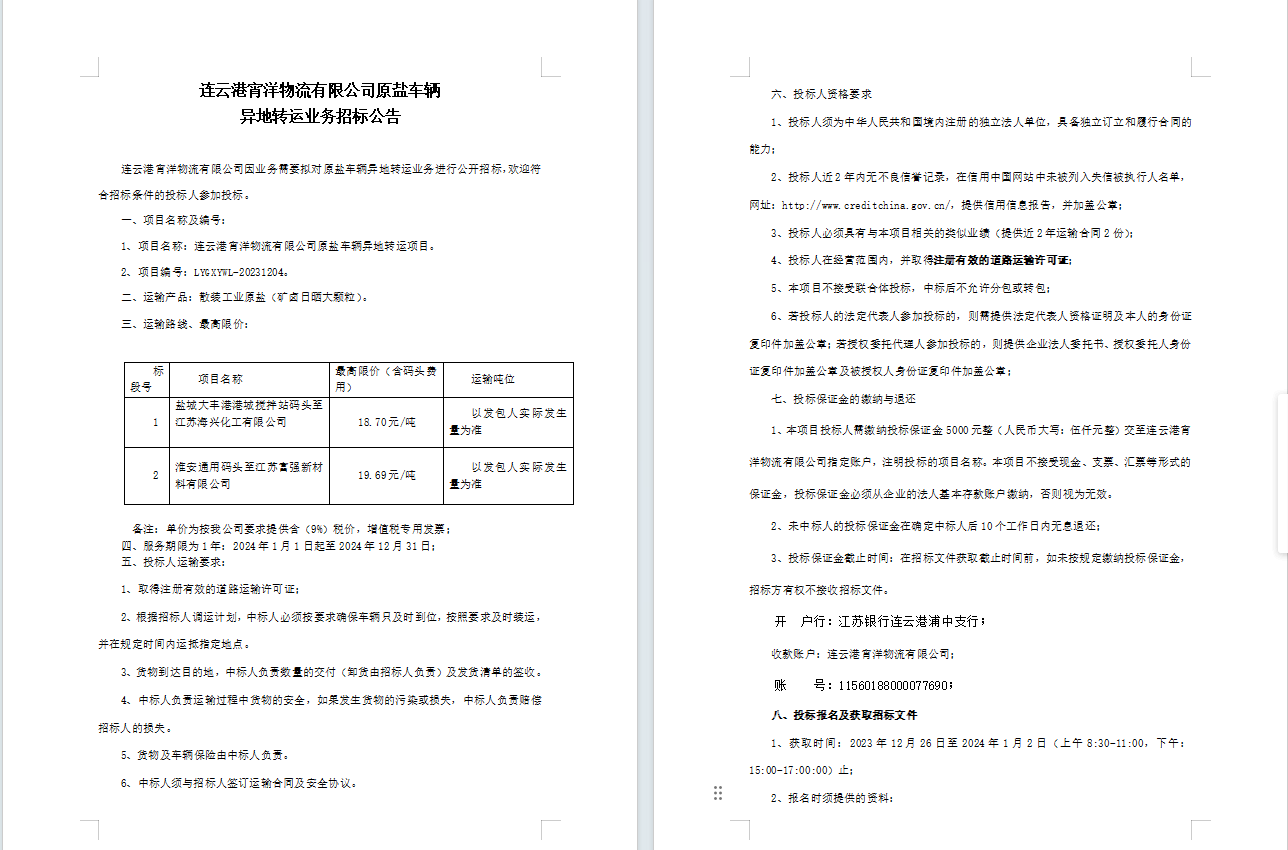 連云港宵洋物流有限公司原鹽車輛異地轉(zhuǎn)運業(yè)務招標公告