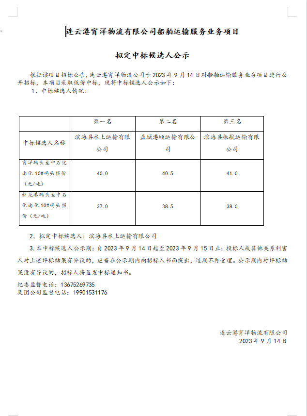 連云港宵洋物流有限公司船舶運輸服務(wù)業(yè)務(wù)項目擬定中標(biāo)候選人公示