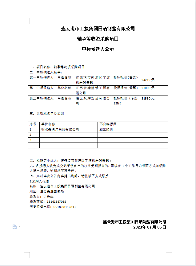 連云港市工投集團(tuán)日曬制鹽有限公司軸承等物資采購(gòu)項(xiàng)目中標(biāo)候選人公示