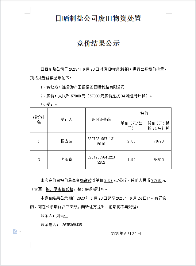 日曬制鹽公司廢舊物資處置競(jìng)價(jià)結(jié)果公示