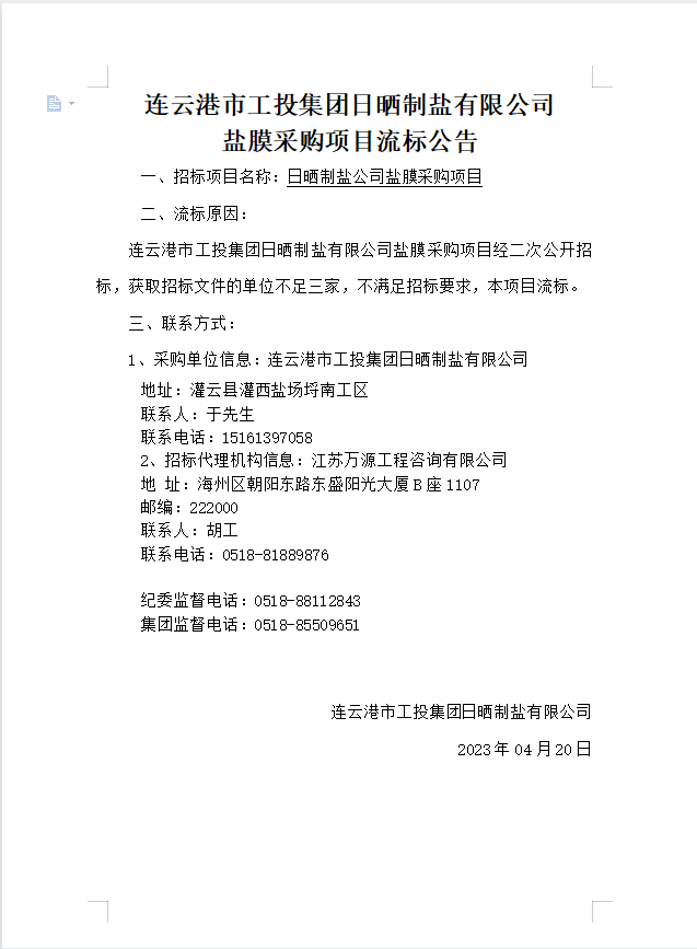 連云港市工投集團(tuán)日曬制鹽有限公司鹽膜采購(gòu)項(xiàng)目流標(biāo)公告