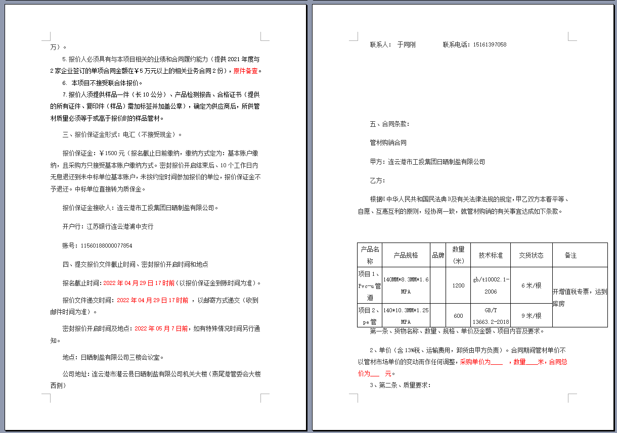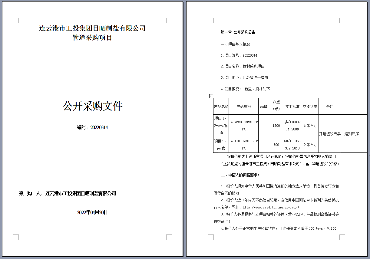 連云港市工投集團日曬制鹽有限公司管道采購項目 公開采購文件