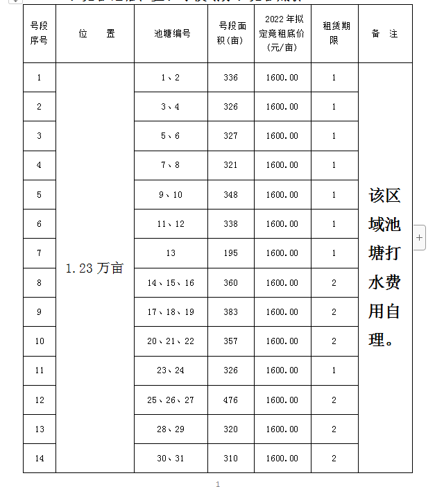 一年期內(nèi)的池塘租賃價格按獲得池塘承租權的競租方報價執(zhí)行。