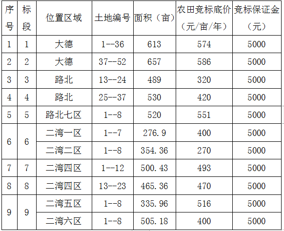 一、競標農(nóng)田標段、位置、面積、競標底價、競標保證金:
