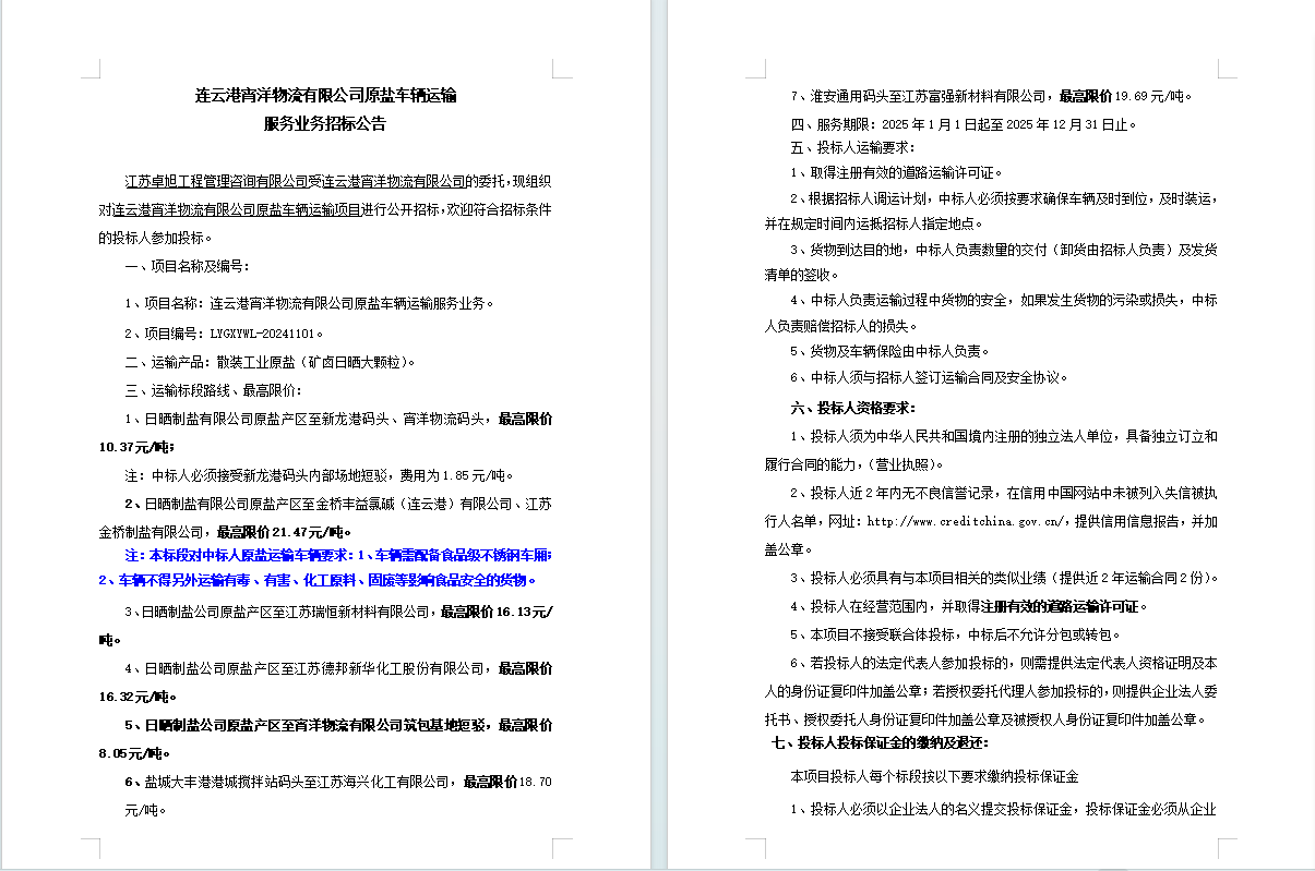 連云港宵洋物流有限公司原鹽車輛運輸服務業(yè)務招標公告