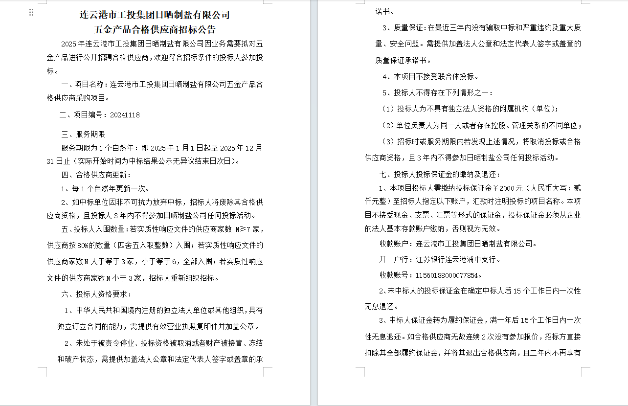 連云港市工投集團(tuán)日曬制鹽有限公司五金產(chǎn)品合格供應(yīng)商招標(biāo)公告