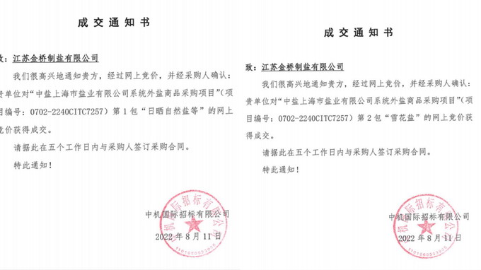 近日,我公司以網(wǎng)上競(jìng)價(jià)的方式,成功中標(biāo)中鹽上海市鹽業(yè)有限公司系統(tǒng)外鹽商品2022-2023年度采購(gòu)項(xiàng)目,標(biāo)的量1.5萬(wàn)余噸。