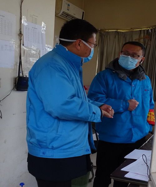 李忠祥檢查門衛(wèi)進(jìn)場(chǎng)人員測(cè)體溫情況(左一)