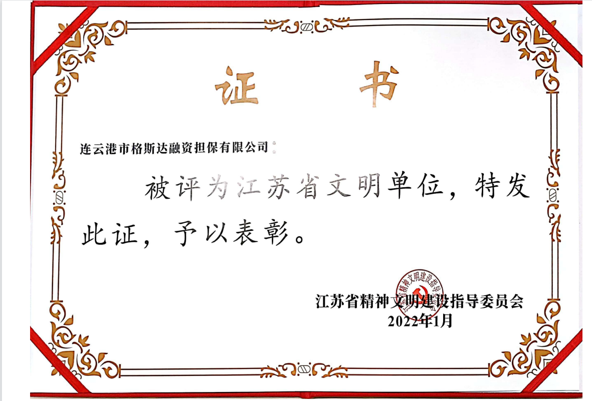 1月,格斯達擔保公司被省精神文明建設(shè)指導委員會評為“江蘇省文明單位”稱號。