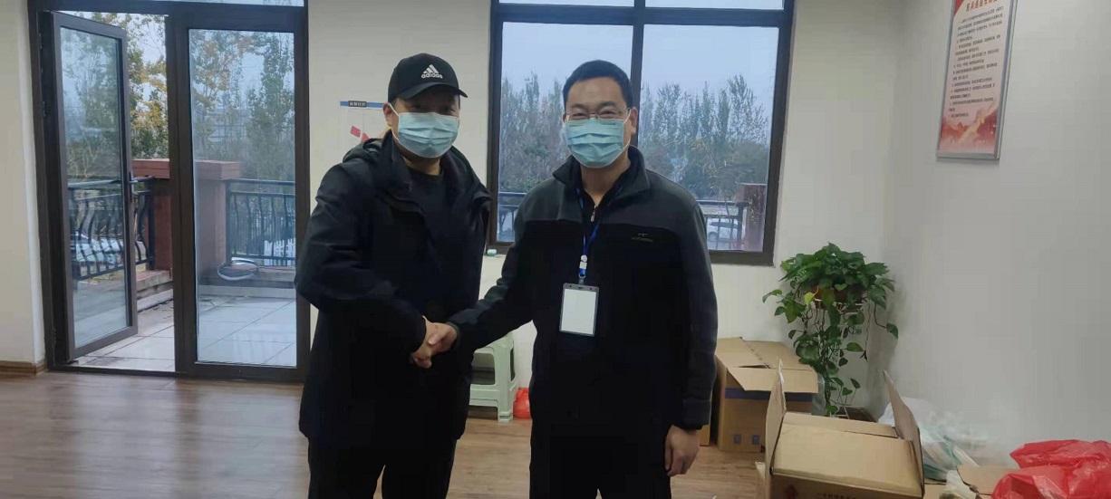 連云港市新浦街道新橋社區(qū)黨委書(shū)記史建國(guó)握著資產(chǎn)公司黨支部副書(shū)記王順友的手說(shuō)“感謝工投志愿者為社區(qū)疫情阻擊戰(zhàn)所做的巨大貢獻(xiàn)”。