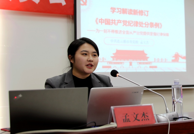 學《條例》,明紀律。特邀請市委黨校孟文杰老師,對新修訂的《中國共產(chǎn)黨紀律處分條例》進行專題輔導。孟老師從深刻理解《條例》修訂的重要亮點、準確把握《條例》修訂的主旨要義、切實抓好《條例》的貫徹執(zhí)行三個方面作了精彩解讀,并堅持理論密切聯(lián)系實際,結(jié)合與修改內(nèi)容相關的案例及視頻,提醒廣大黨員干部嚴于律己、防微杜漸,讓全體黨員干部受益匪淺。