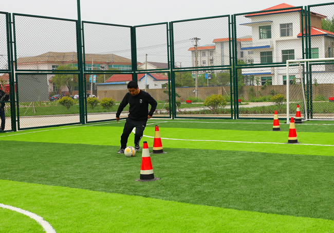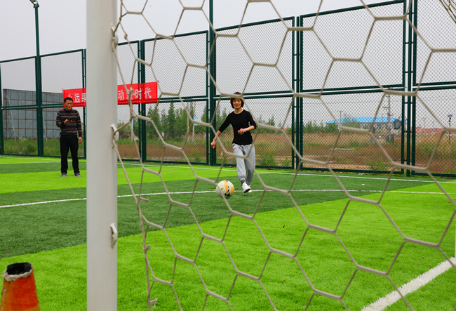 在定位傳球射門比賽中,隊員們對準腳下的足球,快速傳導,精準將足球射入球門。
