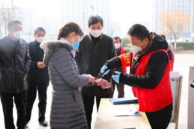 汪書記一行在公司疫情防控檢查站前,詳細了解了公司疫情防控情況,青農(nóng)一路作為主要的進場通道,四個單位的黨員干部輪流值班,并設置臨時看護房,保證二十四小時值班。在鹽場家園小區(qū)僅保留一個出口,外來家用轎車一律禁止入內,每戶發(fā)一張通行證,嚴格管控人員流動。汪書記得知物業(yè)公司還沒有完成,鼓勵大家非常時期用非常辦法,將工作做細做實,想居民所想,嚴格做好防控工作。進入小區(qū)前,汪書記也與居民一樣配合登記和測量體溫,當看物業(yè)為了保證每天定時對單元和電梯間等重要場所的消毒存有大量消毒液,強調物業(yè)公司要增強消毒物品存放安全意識,合理使用,盡最大努力保一方平安。