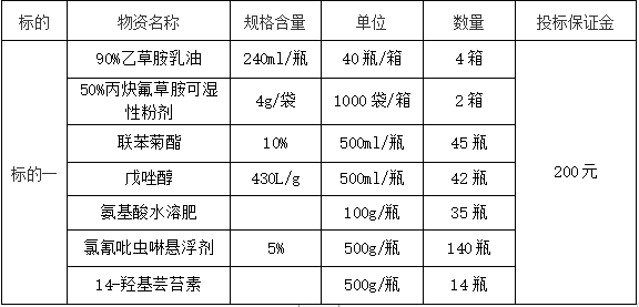 3.原則上由投標(biāo)單位按貨物需求進(jìn)行投標(biāo),若規(guī)格不符,投標(biāo)單位也可以根據(jù)自有包裝規(guī)格進(jìn)行投標(biāo)。本次招標(biāo)采購,確定生產(chǎn)廠家或代理商、農(nóng)藥品種、規(guī)格、劑型和農(nóng)藥單價。