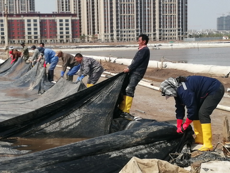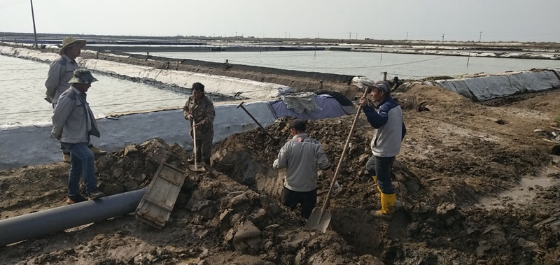 “一二三、起,注意塑布?jí)牡牡胤揭ゾo了”,在西灘組長(zhǎng)沈秀成的帶領(lǐng)下,大家正在清理塑布積水,一場(chǎng)暴風(fēng)雨過后,灘面積聚了大量雨水,擋浪布也損壞較多,為了不影響下一步的人工扒鹽,大伙迅速做好災(zāi)后修復(fù)工作,保住生產(chǎn)成果,確保顆粒歸倉(cāng)。