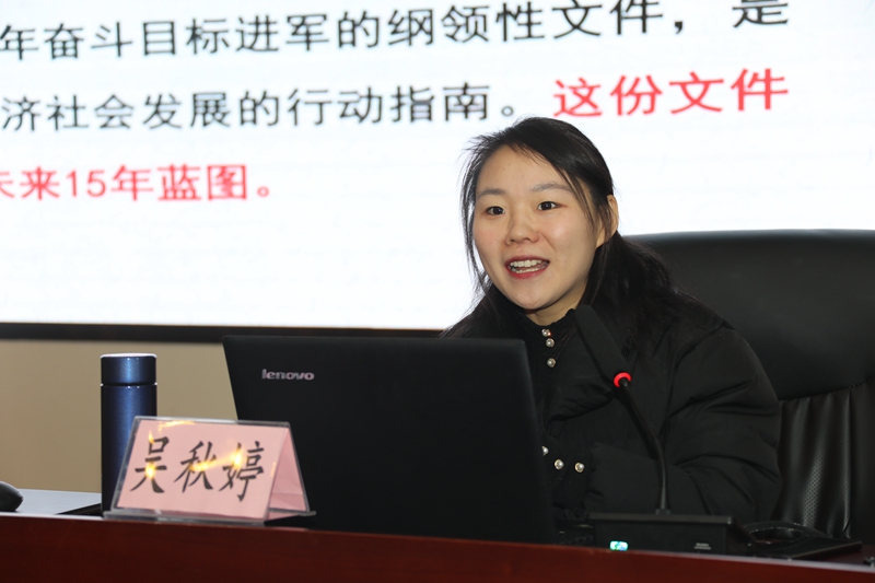吳秋婷副主任在題為“開啟全面建設(shè)社會(huì)主義現(xiàn)代化國(guó)家新征程”報(bào)告中,從新階段與新目標(biāo)、新理念與新部署、新變化與新格局等三個(gè)方面給大家解讀了黨的十九屆五中全會(huì)精神?!靶码A段與新目標(biāo)”部分,介紹了我國(guó)在決勝全面建成小康社會(huì)取得的三大決定性成就,即十三五期間,全面深化改革取得重大突破;經(jīng)濟(jì)實(shí)力、科技實(shí)力、綜合國(guó)力躍上新的大臺(tái)階。在“新理念與新部署”部分,從社會(huì)發(fā)展、創(chuàng)新發(fā)展、統(tǒng)籌發(fā)展等角度分別提出了習(xí)近平總書記在新時(shí)代下對(duì)中國(guó)共產(chǎn)黨人的要求以及我國(guó)社會(huì)發(fā)展必須遵循的基本原則。在“新變化與新格局“部分,強(qiáng)調(diào)實(shí)現(xiàn)“十四五”規(guī)劃和2035年遠(yuǎn)景目標(biāo)意義重大、任務(wù)艱巨,但是前景光明,全黨全國(guó)各族人民要緊密團(tuán)結(jié)在以習(xí)近平同志為核心的黨中央周圍,同心同德,頑強(qiáng)奮斗,積極響應(yīng)十九屆五中全會(huì)對(duì)全黨全國(guó)人民的號(hào)召,奪取全面建設(shè)社會(huì)主義現(xiàn)代化國(guó)家的勝利。