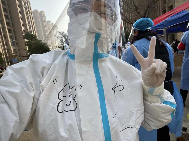 ? 3月12日,晴,8:00到達(dá)社區(qū)核酸采樣點,準(zhǔn)備上崗,社區(qū)負(fù)責(zé)人給我們進行了“防護服穿脫”及防疫知識的講解學(xué)習(xí)等一系列十分細(xì)致地培訓(xùn)后,有點興奮的穿好“大白服”,帶上手套、頭套和面罩,社區(qū)阿姨還幫我在衣服上畫上了可愛的涂鴉;