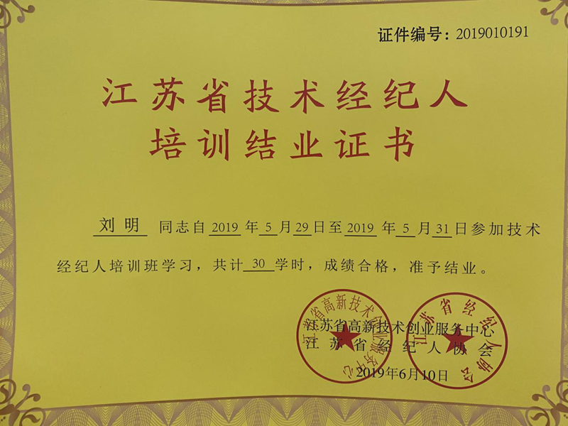 為提高公司服務(wù)質(zhì)量、豐富公司人才類型,美多利公司組織員工參加了江蘇省經(jīng)濟(jì)技術(shù)經(jīng)紀(jì)人培訓(xùn)課程并獲得了培訓(xùn)結(jié)業(yè)證書。