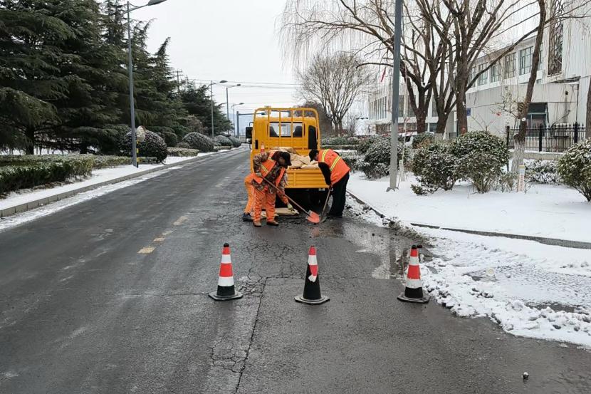 在排患工作中,盛達市政分公司安排2個“道路應急搶修小組”分頭行動,按照巡查組發(fā)現(xiàn)的情況,逐點對雪后道路坑窩等病害迅速展開搶修??紤]冬季氣溫低,不適合傳統(tǒng)熱瀝青修補方式,該公司為盡快解決安全通行問題,決定使用修補王、冷瀝青墊平等應急措施,先對道路坑窩、裂痕等進行臨時性維修,該公司在臨時修補完成后,還對維修點位建立了養(yǎng)護維修臺賬,以便事后巡查及養(yǎng)護,防止點位出現(xiàn)二次病害情況發(fā)生。