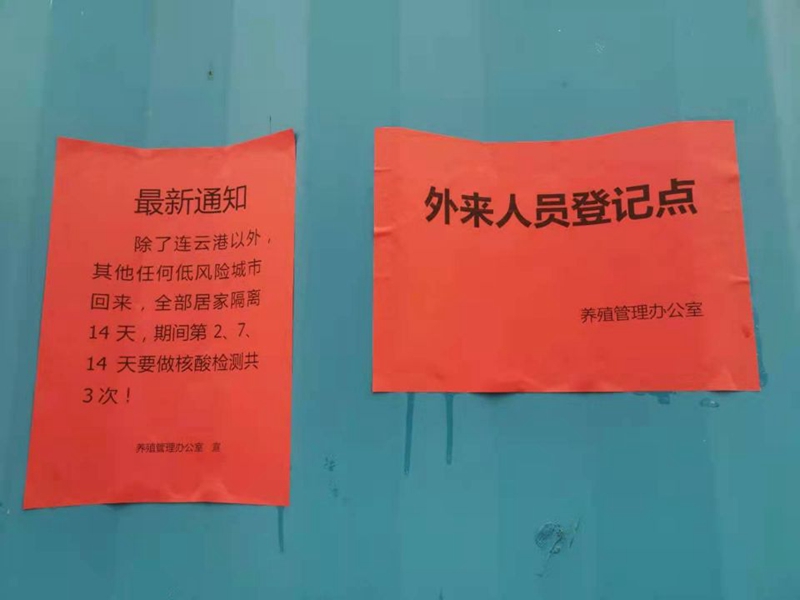 養(yǎng)殖管理辦公室迅速反應(yīng),成立防疫領(lǐng)導(dǎo)小組,加強(qiáng)值班值守,設(shè)置疫情防控設(shè)置隔離點(diǎn)、外來人員登記點(diǎn),張貼疫情動(dòng)態(tài)通知。養(yǎng)殖辦全員到“塘頭”排查是否有人員與中高風(fēng)險(xiǎn)地區(qū)回連人員的接觸史(包括家人和周邊鄰居)和疫苗接種情況;對(duì)來往車輛和人員進(jìn)行逐一登記排查,宣傳防疫注意事項(xiàng);并要求養(yǎng)殖戶不得雇傭除了連云港以外人員干活、不得讓除了連云港以外人員或車輛在池塘進(jìn)出。