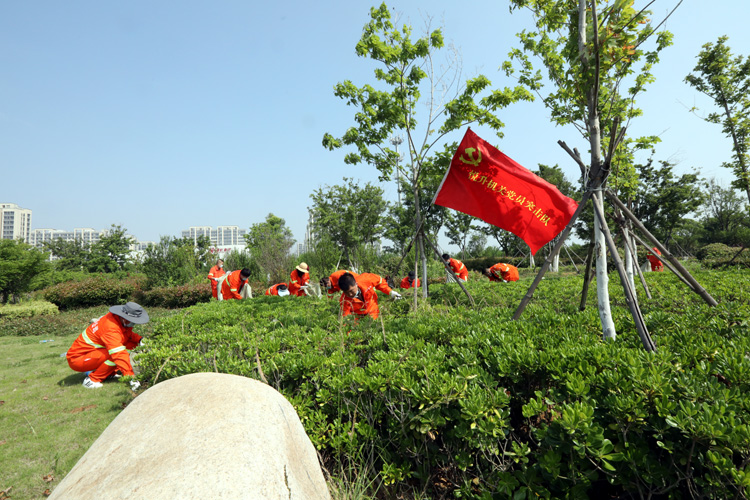 活動分為四組進(jìn)行,四組黨員突擊隊(duì)跟隨引導(dǎo)員的腳步到達(dá)各自片區(qū),進(jìn)行綠化帶雜草清除作業(yè)。在各組支部書記的帶領(lǐng)下,勞動中人人做表率,個(gè)個(gè)干勁足,有條不紊互相配合,一抹抹橘色在清新草色的襯托下格外美麗。