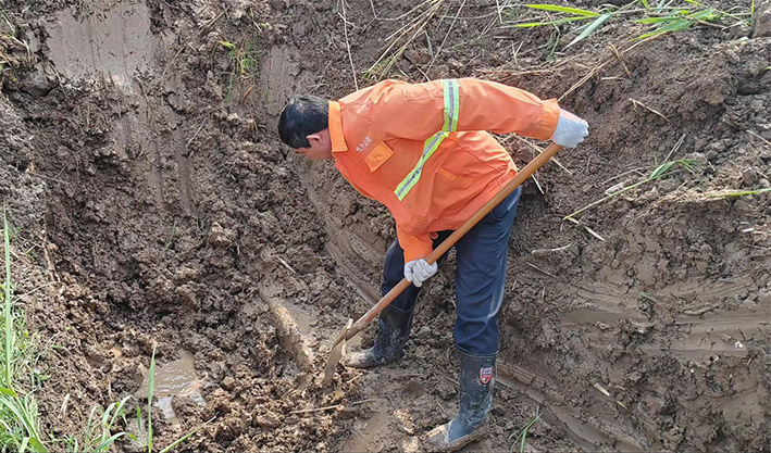 市政分公司組織搶修人員迅速到場,調(diào)集挖機與搶修材料,有序開展應(yīng)急搶修。維修人員首先對漏水管道實施開挖,經(jīng)過維修人員仔細挖開后確定直徑110PVC管道老化導致管道連接端裂開。查明原因后,制定了相應(yīng)可行的搶修方案。搶修過程中,大伙不畏困難、分工有序,相互協(xié)作,在滿是泥濘的坑中開展維修作業(yè)。機械開挖、人工配合清淤、更換損壞管道、增設(shè)哈夫節(jié)等一系列的步驟,一通操作下來,搶修人員人人汗流浹背。經(jīng)過3個多小時連續(xù)奮戰(zhàn),高效完成此次搶修任務(wù)。