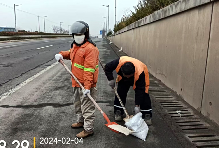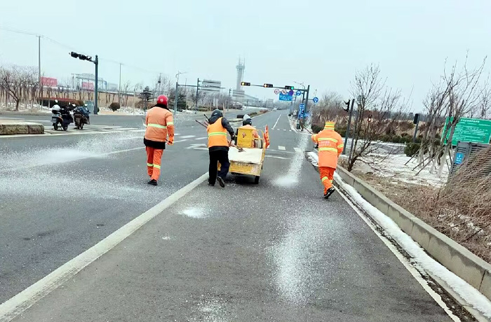 該分公司黨員突擊隊(duì)兵分3路,分別來(lái)到徐圩大道、港前大道、海濱大道核心路段。生產(chǎn)骨干沈萬(wàn)軍、李傳武、張樹(shù)華等同志他們相互配合,手拿鐵锨簡(jiǎn)單有效的進(jìn)行撒放融雪劑60余噸。發(fā)現(xiàn)道路低洼結(jié)冰處及車輛轉(zhuǎn)彎口,他們立即下車?yán)醚╃P,有來(lái)有回的將冰凍鏟除,消除路面一切安全隱患。