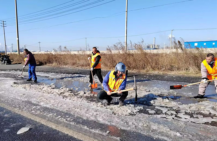 近期由于受冷空氣影響,氣溫低下,園區(qū)道路低洼積水處產(chǎn)生大面積結(jié)冰現(xiàn)象,如不及時(shí)清除,嚴(yán)重造成車輛側(cè)翻事故發(fā)生。道路排查現(xiàn)場(chǎng),管理人員及時(shí)與園區(qū)二班對(duì)接,聯(lián)合開展“破冰保暢通”突擊活動(dòng)。大家各負(fù)其責(zé),齊心協(xié)力,揮動(dòng)手中鐵銑、羊鎬,經(jīng)過近4個(gè)多小時(shí)共同奮戰(zhàn),撬動(dòng)冰塊近400多塊,清理積水300多平方、20多處。