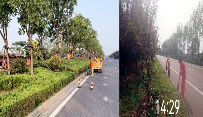 為提高工作效率,該分公司綠化班組在云港路、祥和路核心區(qū)域,采取人機結(jié)合方式,兵分4路同步推進“秋剪”作業(yè)。既:1路,班長帶領(lǐng)工人負責對道路中間球類修剪造型。植物相對茂盛,腳下視野遮擋,工人舉著機器,一步一步往前推進作業(yè)。2路,負責對道路兩側(cè)色帶綠籬安排修剪,及時清理枯樹枝和雜草保持綠化帶干凈整潔。3路,綠化帶內(nèi)高凹不平雜草遮住視野,作業(yè)有點難度,在安全員的帶領(lǐng)下用割灌機負責對道路兩側(cè)密集的雜草進行清理作業(yè)。4路,用掃把和網(wǎng)兜清掃前面一組剪掉的碎葉,保障道路整潔暢通。