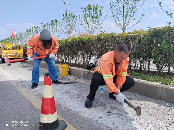 228省道西側(cè),班長(zhǎng)姚功巡查時(shí)發(fā)現(xiàn),有近50多米長(zhǎng)混凝土攪伴物拋灑主干道路面,如不及時(shí)處理,嚴(yán)重影響路面行車安全。班長(zhǎng)姚功及時(shí)召集隊(duì)員,馬不停蹄趕赴道路現(xiàn)場(chǎng)。上午10時(shí)左右,室外氣溫已經(jīng)直逼35℃,大家顧不上天氣的炎熱,揮動(dòng)手中鐵錘,不停地震動(dòng)路面“凍結(jié)”已久的水泥,黨員胡可貴與同事徐育軍、伏彩林主動(dòng)參戰(zhàn),交替使用手中的撬棍,盡管汗水浸透橙色衣衫,雙手磨出了血泡,大家也沒(méi)有叫苦叫累,經(jīng)過(guò)近三個(gè)多小的努力奮戰(zhàn),終于恢復(fù)原有黑色柏油路面。