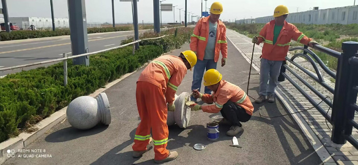 維修班組成員經(jīng)過(guò)多日實(shí)地考察,結(jié)合道路現(xiàn)場(chǎng)實(shí)際情況制定了維修計(jì)劃,并對(duì)部分道路上擋車樁點(diǎn)位、間距設(shè)置進(jìn)行了合理調(diào)整,來(lái)規(guī)避擦碰現(xiàn)象發(fā)生。在石化三路一處施工現(xiàn)場(chǎng),兩組隊(duì)員頂著炎炎烈日正在非機(jī)動(dòng)車道上進(jìn)行擋車柱安裝工作,他們配合默契,利用開孔鉆、鐵锨等工具開孔、清掏、埋設(shè)樁柱,然后用混凝土填充、壓實(shí)地下部分,最后整平路面。安裝好之后將有效阻止機(jī)動(dòng)車隨意占用人行通道,達(dá)到安全目的。本次施工共安裝維修擋車柱36個(gè)、穩(wěn)固球狀擋車石約180多處。